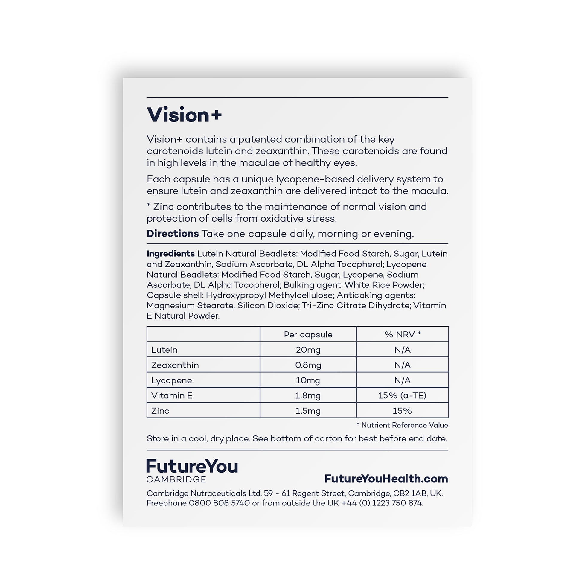 Vos yeux travaillent dur chaque jour, c'est pourquoi Future You a développé Vision+ pour leur apporter le soutien nutritionnel dont ils ont besoin. Cette formule contient du zinc, qui contribue au maintien d'une vision normale et au métabolisme de la vitamine A.